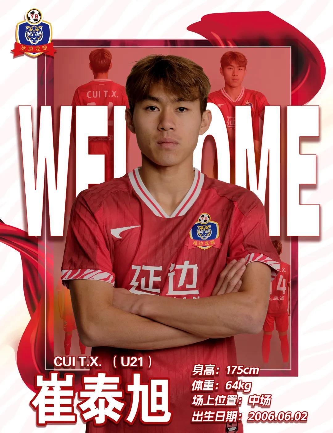 欢迎崔泰旭正式加盟延边龙鼎足球俱乐部,期待这名潜力出众的年轻球员,能在中场位置展现自身实力与风采,以青春热情与扎实表现为球队注入新活力,帮助球队再创佳绩。美丽延边欢迎你!